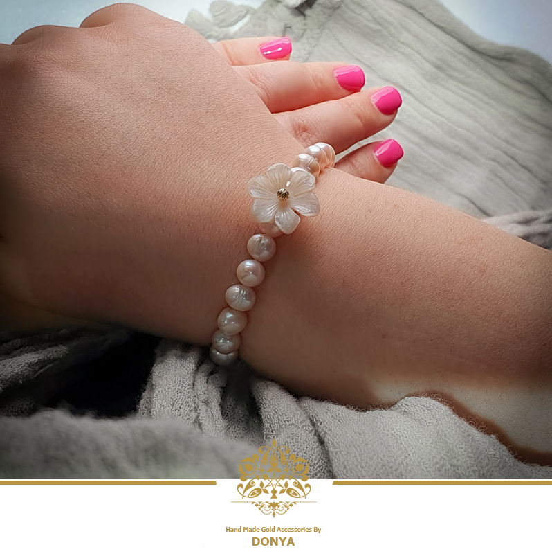 دستبند گوی طلا کار شده داخل صدف تراش گل به همراه بافت مروارید پرورشی قابل تنظیم