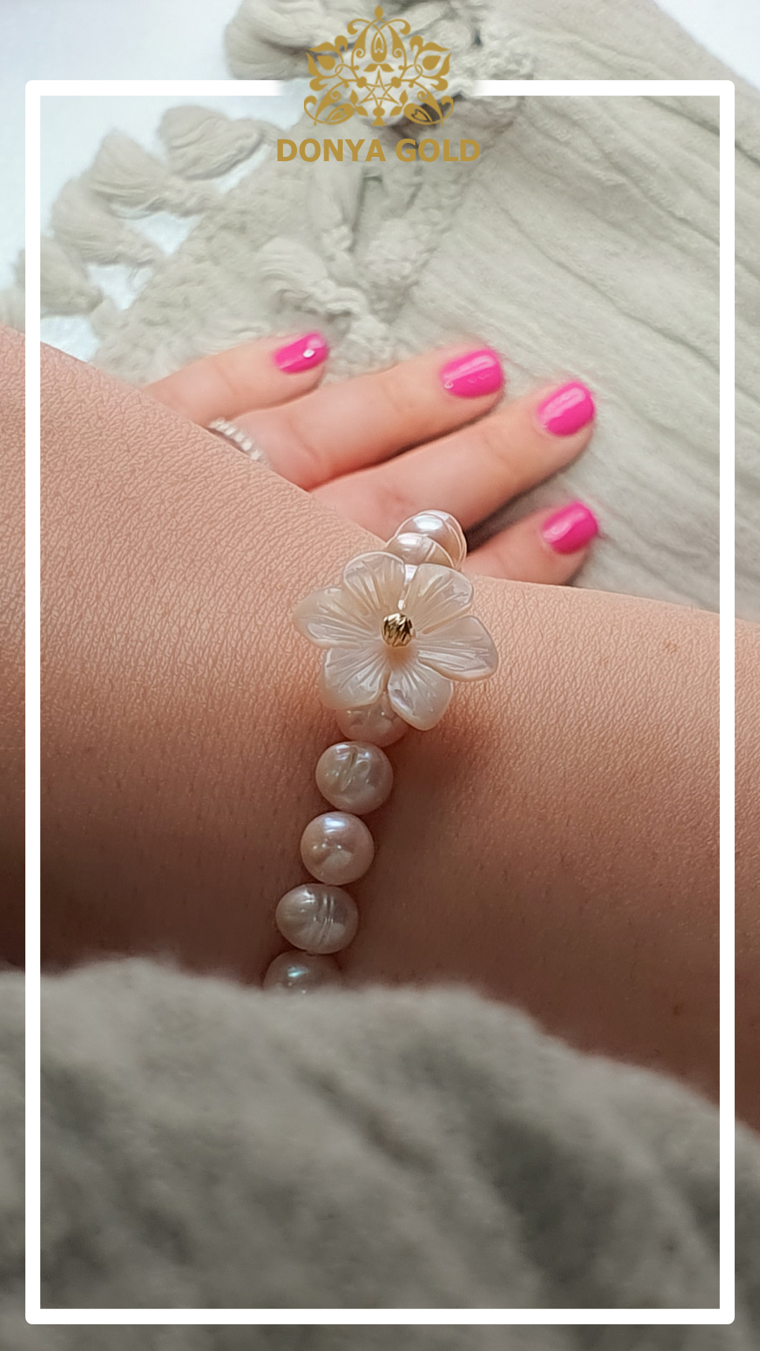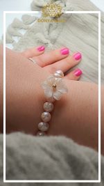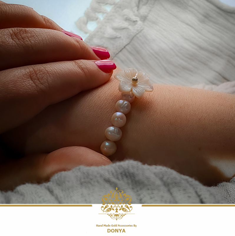 دستبند گوی طلا همراه با صدف تراش گل و بافت مروارید پرورشی